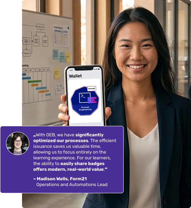 Issue digital certificates quickly and efficiently with Open Educational Badges (OEB). Make your learners’ competencies visible through standardized, tamper-proof credentials—while simultaneously boosting your institution’s profile and reach.