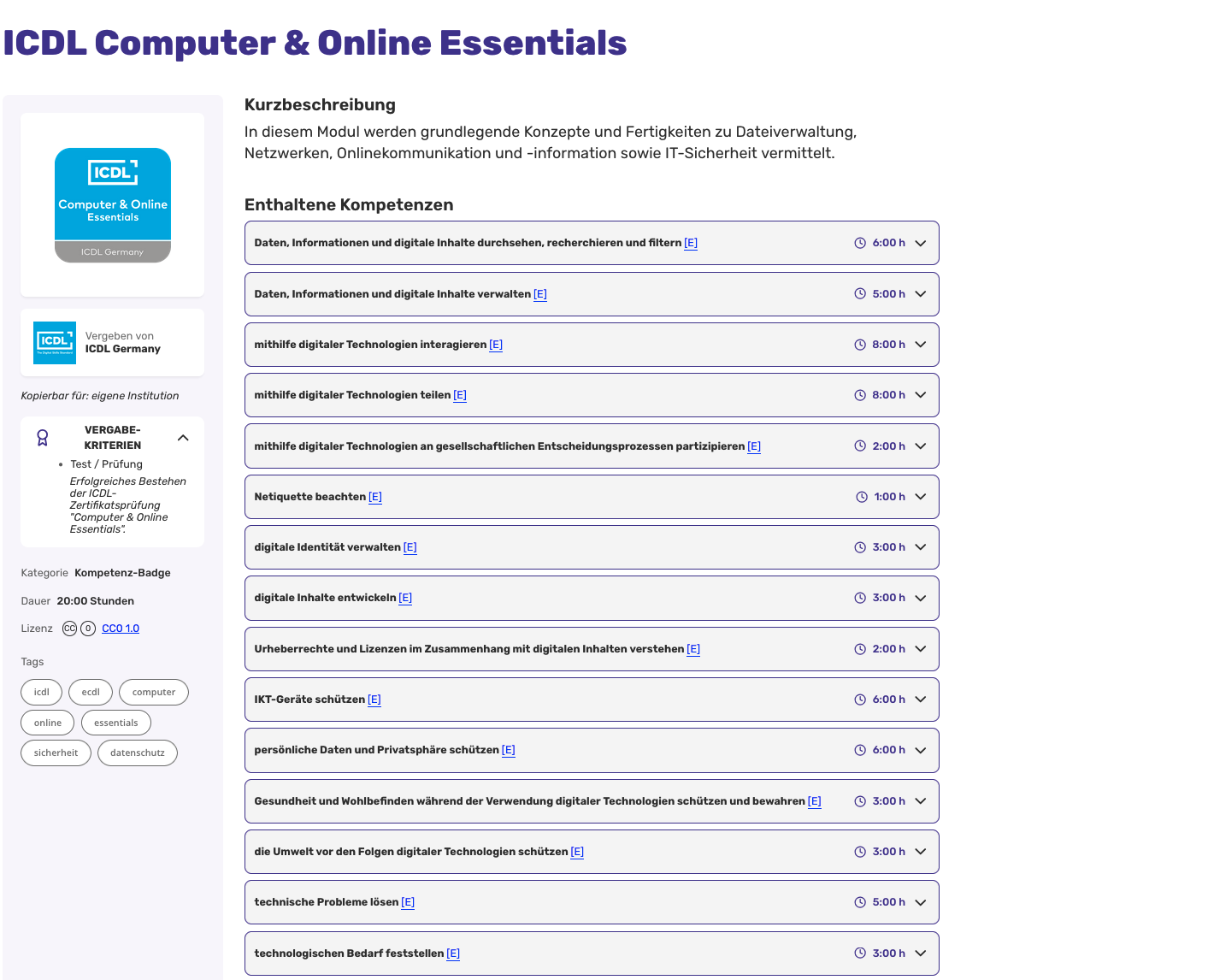 At first, it felt unfamiliar to DLGI that OEB represents competency acquisition in terms of time. Since DLGI does not deliver courses itself but provides learning materials and administers exams, specifying hours initially seemed difficult to assess. On closer examination, however, it became clear that ICDL already provides partners with guideline estimates for the duration of each module. These can be meaningfully broken down to the level of individual competencies, creating a consistent point of reference. Today, the team clearly sees the added value: time-based information makes badges more precise and offers helpful transparency for both learners and partner institutions.