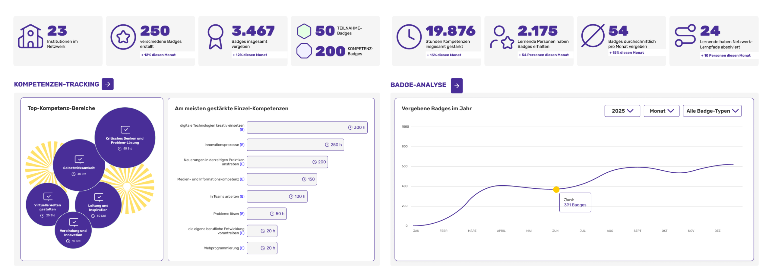 Ab Frühjahr 2026 wird diese Wirkungsperspektive durch OEB weiter unterstützt: Das aktuell entstehende OEB-Dashboard visualisiert automatisiert die über Badges anfallenden Daten. Organisationen können so auf einen Blick erkennen, wie sich Badge-Vergaben, Kompetenzfelder und Programme über die Zeit entwickeln. Ergänzend ist eine Export-Funktion geplant, die Daten für interne Auswertungen, Wirkungsberichte oder die Kommunikation gegenüber Förderern und Partnerorganisationen nutzbar macht. So wird es möglich, Wirkung nicht nur qualitativ zu beschreiben, sondern datenbasiert zu analysieren und Lernangebote gezielt weiterzuentwickeln.