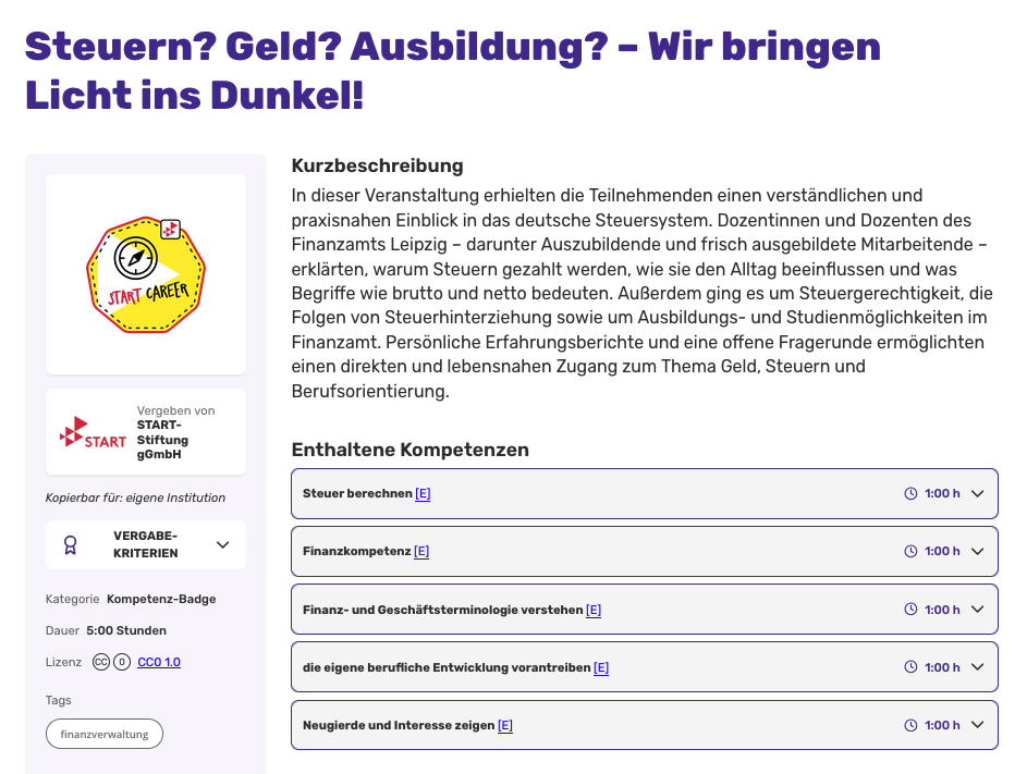 Ausgangspunkt für die Badge-Erstellung bei START sind Kursbeschreibungen, die ohnehin für die Kommunikation der Kurse entstehen. Darauf aufbauend tauscht sich das Team mit Kursleitungen und Mentor:innen aus, um zu klären, welche Kompetenzen vermittelt werden. Für die Zuordnung nutzt START sowohl den KI-Assistenten auf OEB als auch eigene Recherchen im ESCO*-Raster. Der KI-Assistent dient als strukturierende Unterstützung und ergänzt die fachliche Einschätzung des Teams durch zusätzliche Vorschläge. Da viele Veranstaltungstexte bewusst kurz und niedrigschwellig gehalten sind, ist es umso wichtiger, diese Hinweise fachlich einzuordnen und entlang der eigenen Wirkungslogik gezielt zu priorisieren. Diese Kompetenzen sind dann fester Bestandteil des Badges.